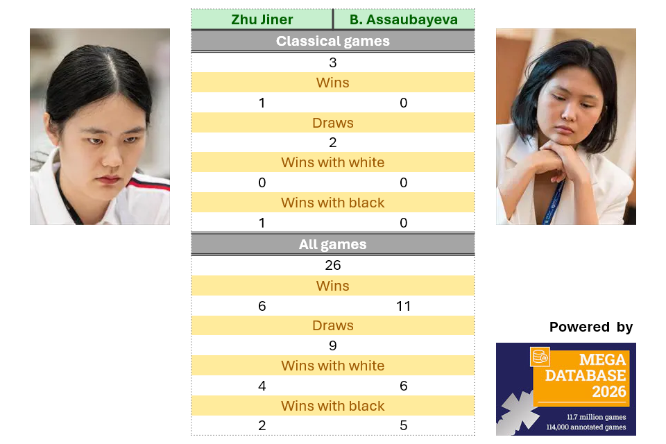 Zhu Jiner and Bibisara Assaubayeva only played three classical games so far. In the only decisive classical encounter, Zhu won with black at the 2018 World Junior Championship.