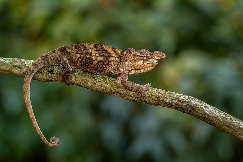 Bohme’s two-horned chamaeleon (Kinyongia boehmei) is a medium-sized reptile that survives in the mountainous forests of southeastern Kenya, especially the Taita Hills. Its body is a greenish brown, but it can display a variety of mottled colorations. Males have two small cranial “horns” on the nose. It feeds on insects and small arthropods, capturing prey with a long, sticky tongue.
