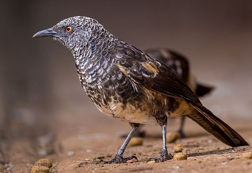 Found in central Kenyan dry forests, Hinde’s babbler (Turdoides hindei) is a highly social songbird known for its constant chattering. This species makes its home within thickets, remnant natural forests, and shrubland around Mt. Kenya, the Abedares, and Machakos. It displays earthy brown feathers streaked with pale mottling on the head, throat, and chest. It has red-orange eyes, a black beak, and a cream-white belly.