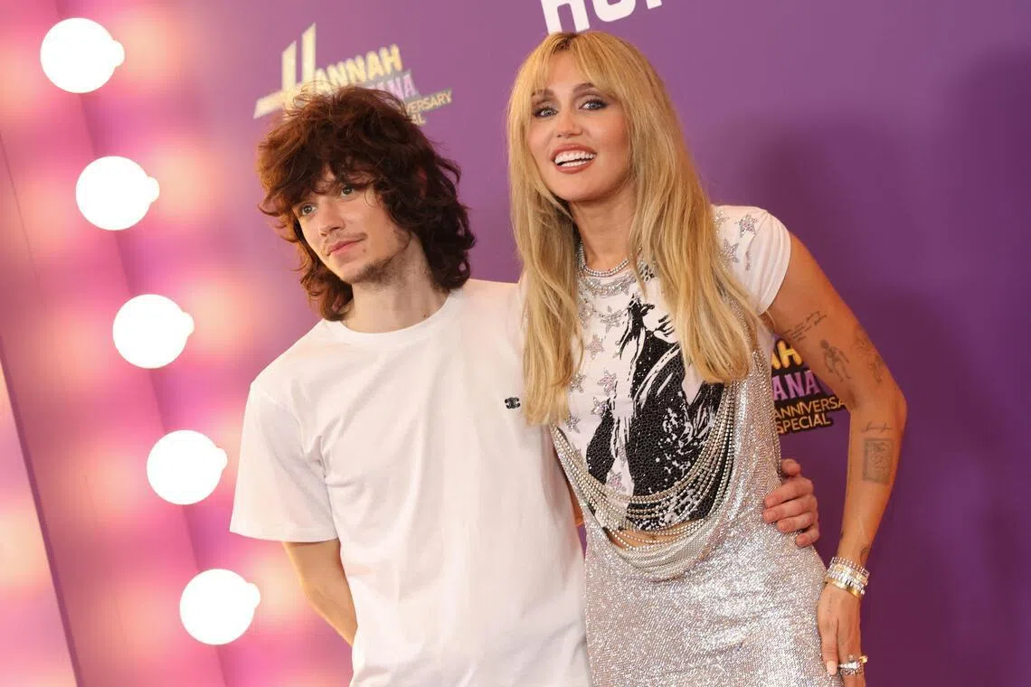 Miley Cyrus (right) and fiance Maxx Morando at the world premiere of the Hannah Montana 20th Anniversary Special in Hollywood, California, on March 23, 2026.