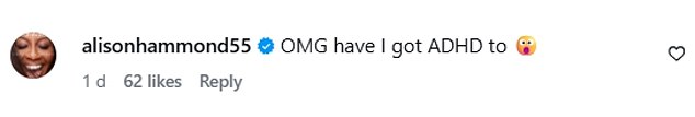 Alison Hammond wrote in the comments: ‘OMG have I got ADHD too’, while Annie Lennox typed: ‘Nadia!!!! We’re in the same tribe!!!!’
