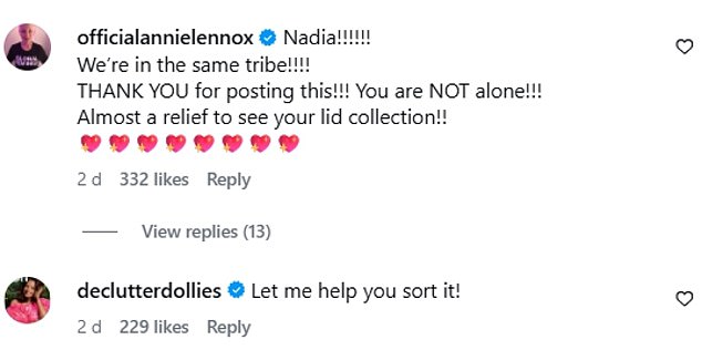 Alison Hammond wrote in the comments: ‘OMG have I got ADHD too’, while Annie Lennox typed: ‘Nadia!!!! We’re in the same tribe!!!! THANK YOU for posting this!!! You are NOT alone!!! Almost a relief to see your lid collection’.