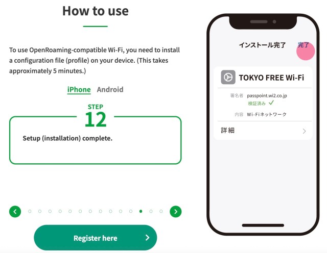 After registering, your phone will automatically connect to TOKYO_FREE_Wi-Fi whenever you’re near a supported spot with no need to login again, giving you quick and easy accees to the secure encrypted connection provided by OpenRoaming.