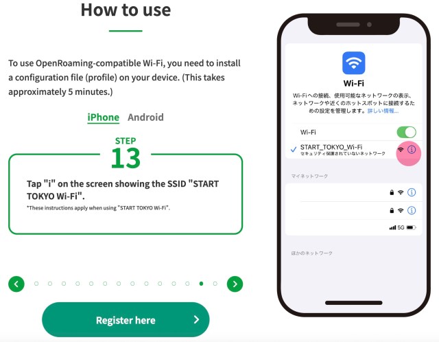 If you have no Internet connection to begin with, simply turn on Wi-Fi on your phone while at the booth and look for a network called START_TOKYO_Wi-Fi. Connect to it and the setup page should open automatically.