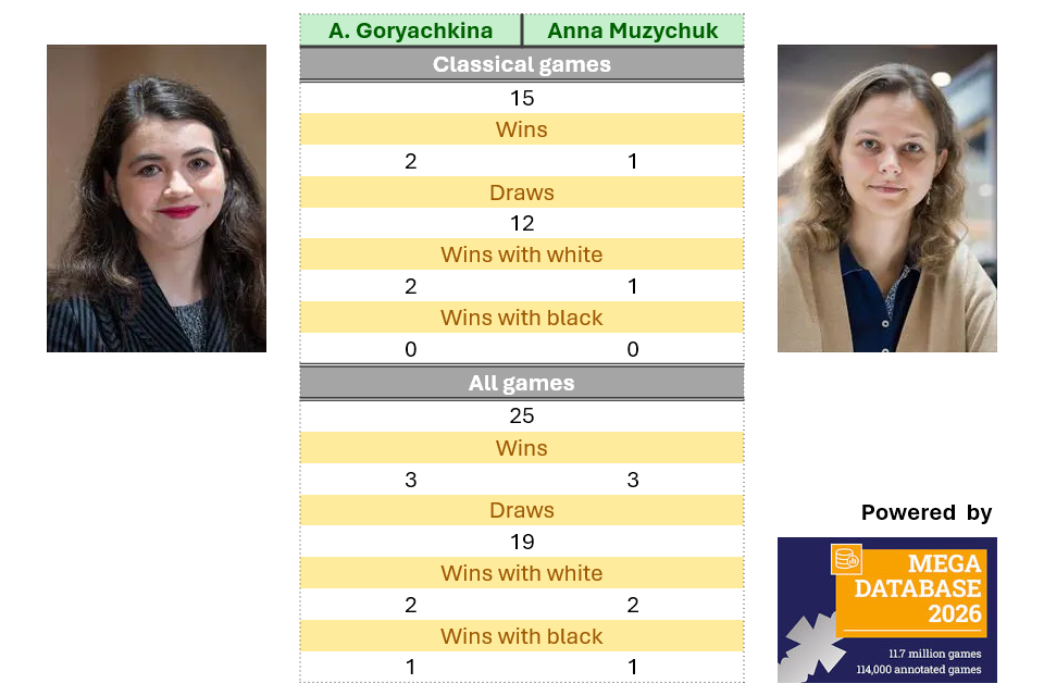 Aleksandra Goryachkina and Anna Muzychuk have drawn most of their encounters, both in classical chess and in their games across all formats. Goryachkina has a 2-1 advantage over Muzychuk in their decisive classical confrontations – she won both games with the white pieces.