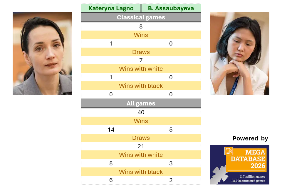 Kateryna Lagno has a clear advantage over Bibisara Assaubayeva in their confrontations across all formats. In classical games, seven out of their eight encounters finished drawn. Lagno won the remaining game, with white at the 2024 Shymkent Grand Prix.