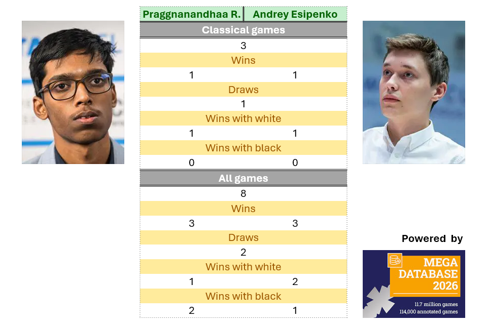 Praggnanandhaa Rameshbabu and Andrey Esipenko have an even score both in their classical games and in their encounters across all formats.
