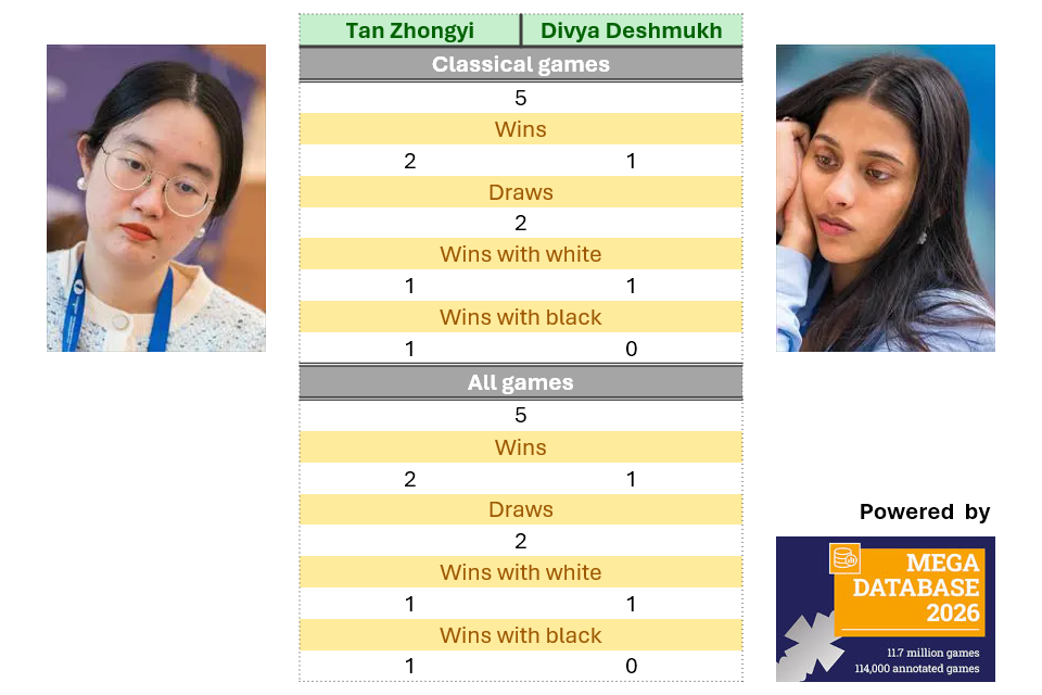 All games recorded of Tan Zhongyi facing Divya Deshmukh were played in a classical format. Tan has a 2-1 advantage in the games that featured decisive results.