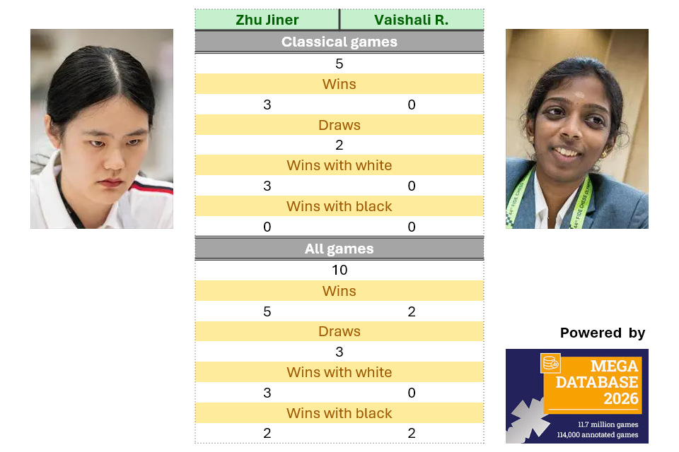 Zhu Jiner has defeated Vaishali Rameshbabu in three out of their five classical games. The remaining two games ended drawn.