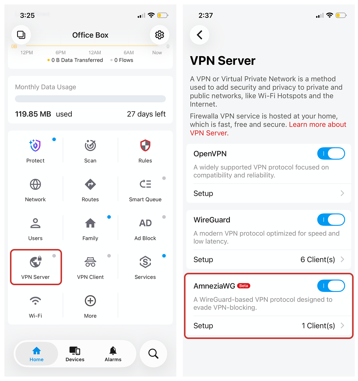 The new VPN interface within Firewalla app. Image courtesy of Firewalla