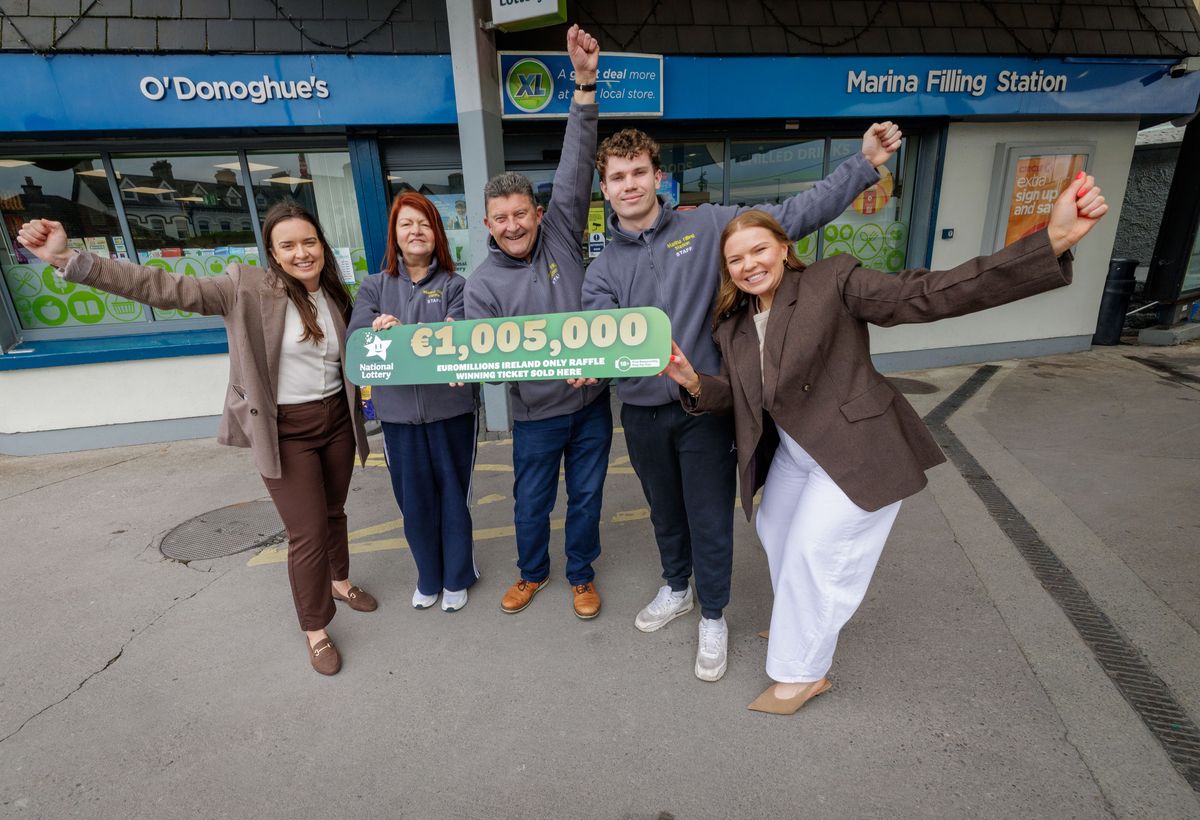 Tim O’Donoghue celebrates with Marina XL Filling Station staff May Cremin, Christian Murphy Cronin and Lotto sales rep Niamh O’Donovan and National Lottery Executive Emma Monaghan
