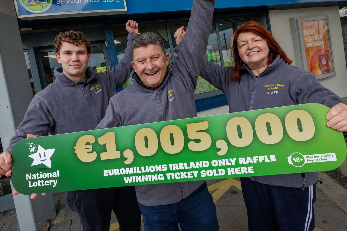 Store owner Tim O’Donoghue (center) celebrates selling a €1m ticket with staff Christian Murphy Cronin and May Cremin at Marina XL Filling Station(Image: Dylan Vaughan)