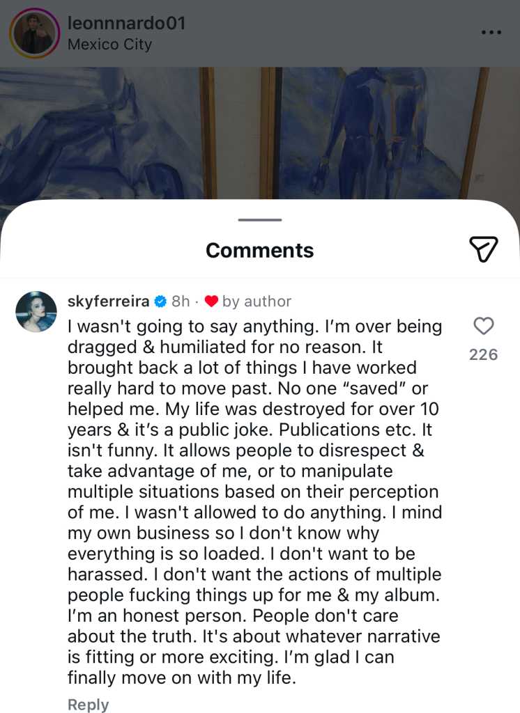 “I wasn’t allowed to do anything. I mind my own business, so I don’t know why everything is so loaded. I don’t want to be harassed. I don’t want the actions of multiple people fucking things up for me and my album. I’m an honest person. People don’t care about the truth. It’s about whatever narrative is fitting or more exciting. I’m glad I can finally move on with my life.”