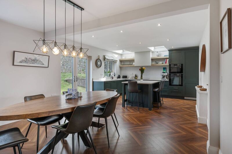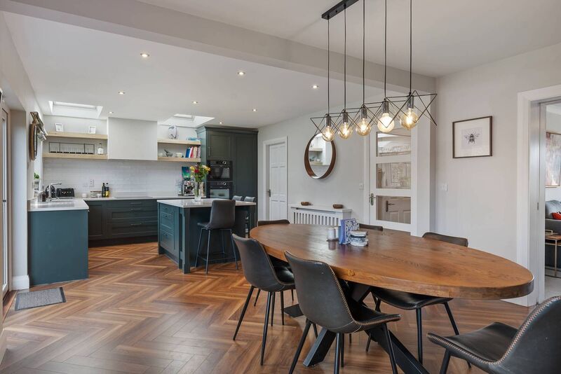The hunter green units and island stand out strongly against white subway wall tiles and the warm brown, herringbone, laminate parquet flooring. And two roof lights provide natural light.