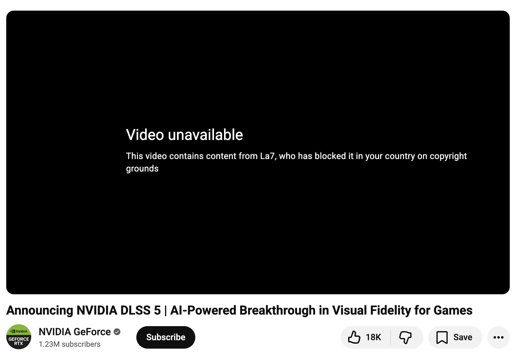 YouTube removes Nvidia’s own DLSS 5 trailer after a takedown request from an Italian TV channel.