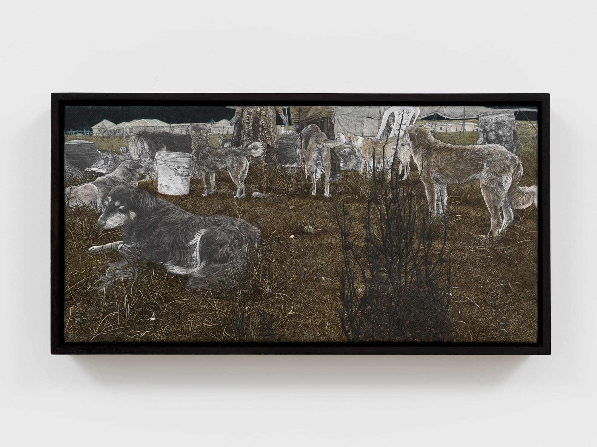 Viewers encounter further evidence of that separateness in the upstairs gallery. In “Intsingiselo II” (2026) (“meaning”), a pack of dogs is gathered together, some lying down, others standing, near a large white plastic bucket. We see a man and woman standing side by side on the upper right side, their heads cropped by the painting’s top edge. The dog lying in the foreground on the lower left has white pupils, the clearest sign of otherworldliness in this scene. The viewpoint is low to the ground, but the white-pupiled dog takes no notice of us. We are part of the scene, but as intruders, invisible to its closed world.