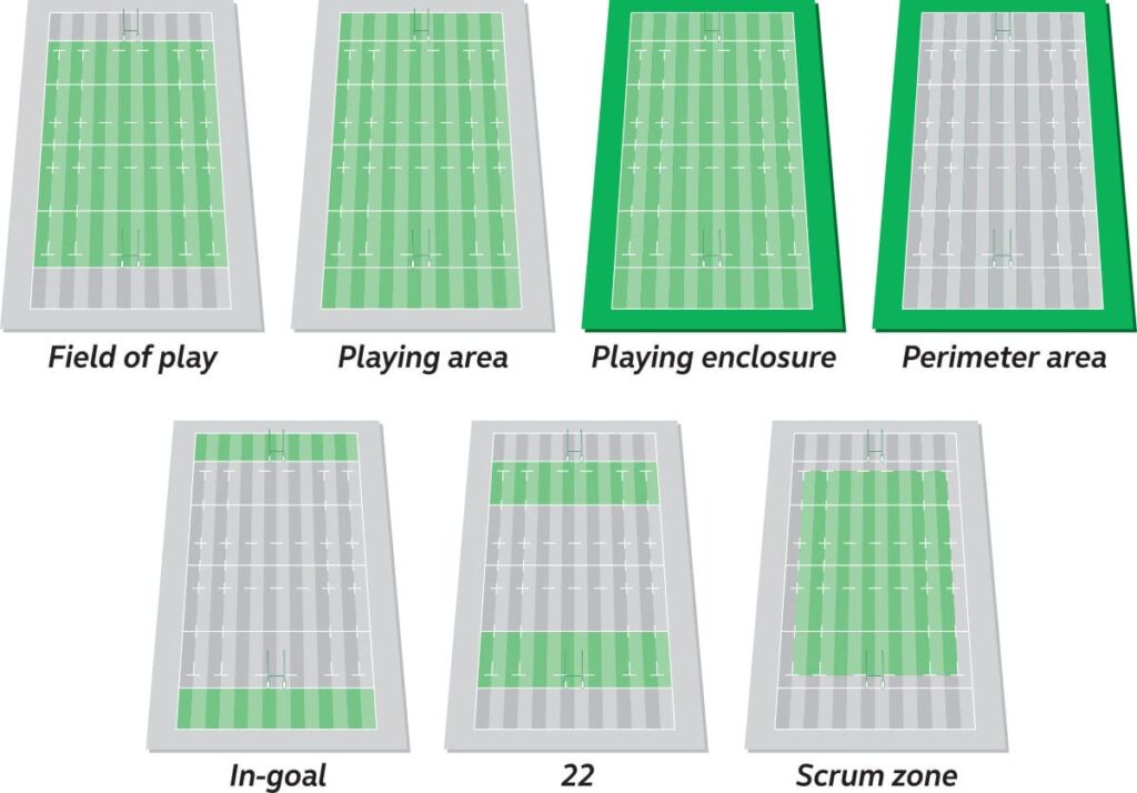 The first illustration on the image below, via World Rugby’s website, shows what is deemed to be in the field of play and the one below it the in-goal are.