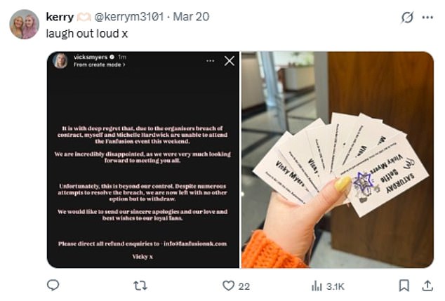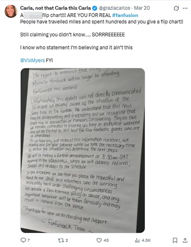 In a post on X, Vicky wrote: ‘It is with deep regret that due to the organisers breach of contract, myself and Michelle Hardwick are unable to attend the FanFusion event this weekend.