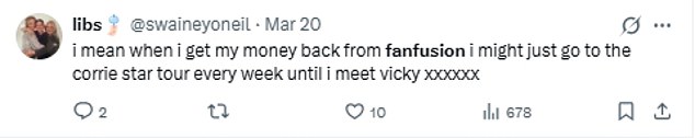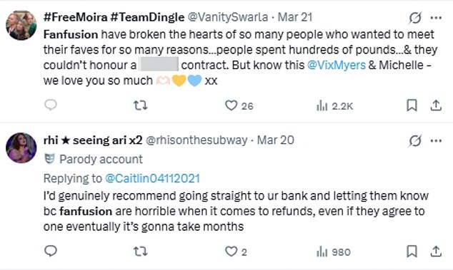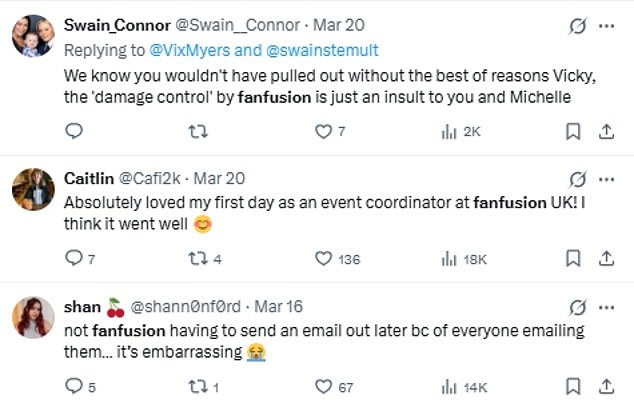 Many fans expressed their disappointment on social media, writing: ‘Wtaf have fanfusion done to make Vicky and Michelle cancel the day before;