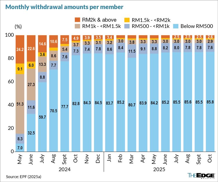 Total withdrawal values mirrored this pattern, reaching RM6.01 billion in May 2024 before falling to RM1.97 billion in June and RM990 million by August. From September to December 2024, monthly withdrawals tapered to roughly RM500 million, remaining stable between RM420 million and RM530 million from January to October 2025, with a slight uptick in March.