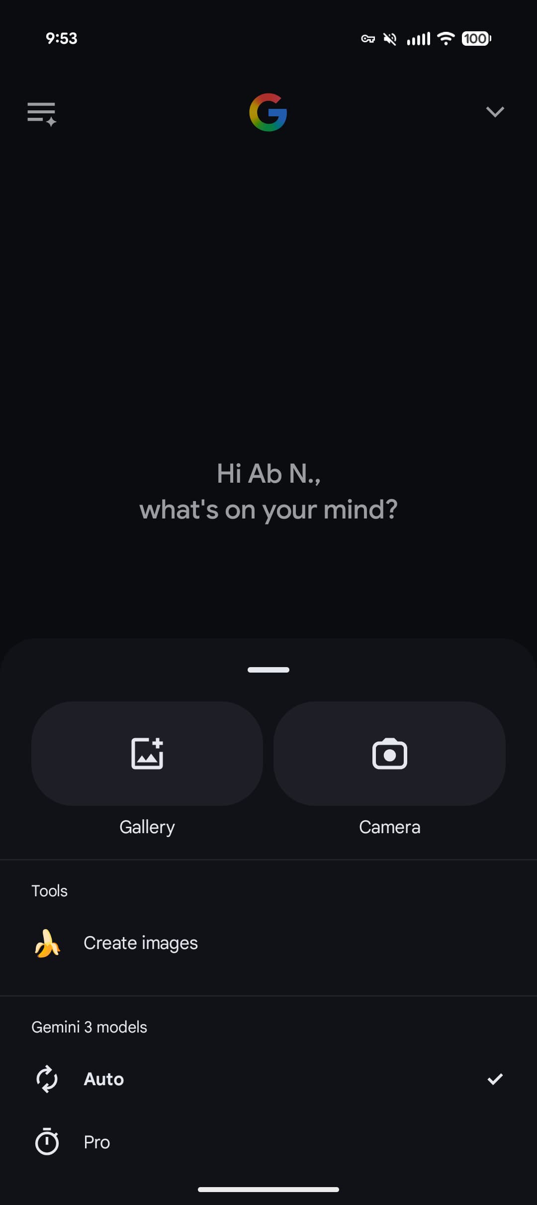 There are very large buttons for Gallery and Camera. “Tools” is the next section, with “Create images” being the only one available on mobile. The “Gemini 3 models” switcher is last with Auto or Pro.