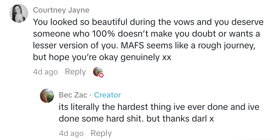 While she didn’t spill much tea within the video or in the caption, Bec revealed to a commenter that the show was “literally the hardest thing” she’s done.