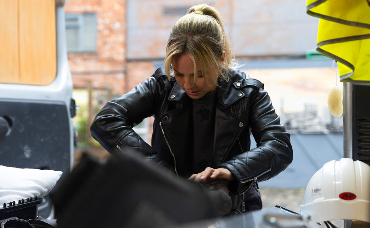 Hoping to strengthen the case against him, Sarah later takes matters into her own hands. Heading to Theo’s van, she lets herself in and searches through his holdall, locating a tablet which could hold crucial evidence.