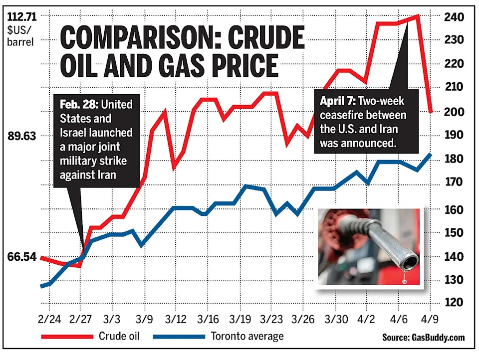 In addition to the effects of the war in the Middle East, gas stations started using a more expensive summer blend on Wednesday, which typically costs about 10 cents more per litre than the winter blend and would negate the federal excise tax cut of about four cents per litre for diesel and 10 cents per litre for gasoline.