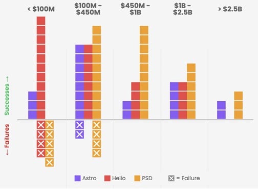 Graph showcasing the different missions in the different cost and science categories, including the failures. Credit - A.H.D. Koeppel & C. Dreier *Graph showcasing the different missions in the different cost and science categories, including the failures. Credit – A.H.D. Koeppel & C. Dreier*