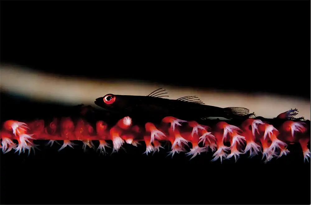 I took this picture of a whip coral goby perched on top of its host in Milne Bay in Papua New Guinea in 2009. I was experimenting a lot with my lighting, playing around with using either one or two strobes, plus a homemade snoot. I was delighted with this image, spotlighting the goby’s eye with the rest of the fish silhouetted against the lit whip coral behind it.
