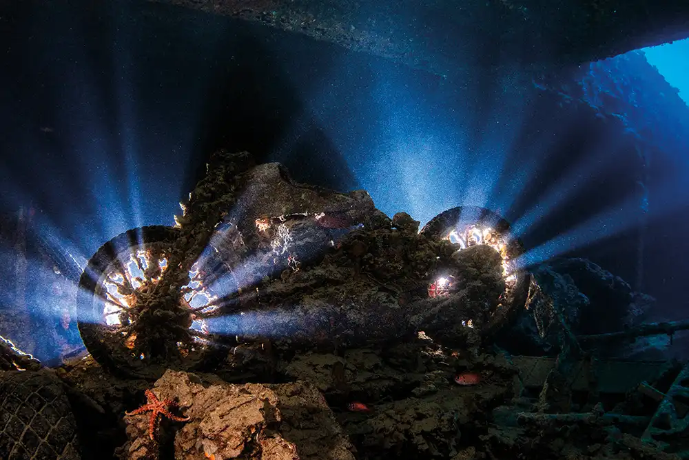 We positioned off-camera strobes and video lights behind the wheels using backlighting to create distinct beams and define the silhouette against the cavernous interior. A small window of natural light provides essential perspective and a resident starfish in the foreground highlights the vibrant biodiversity that now inhabits this site of conflict.