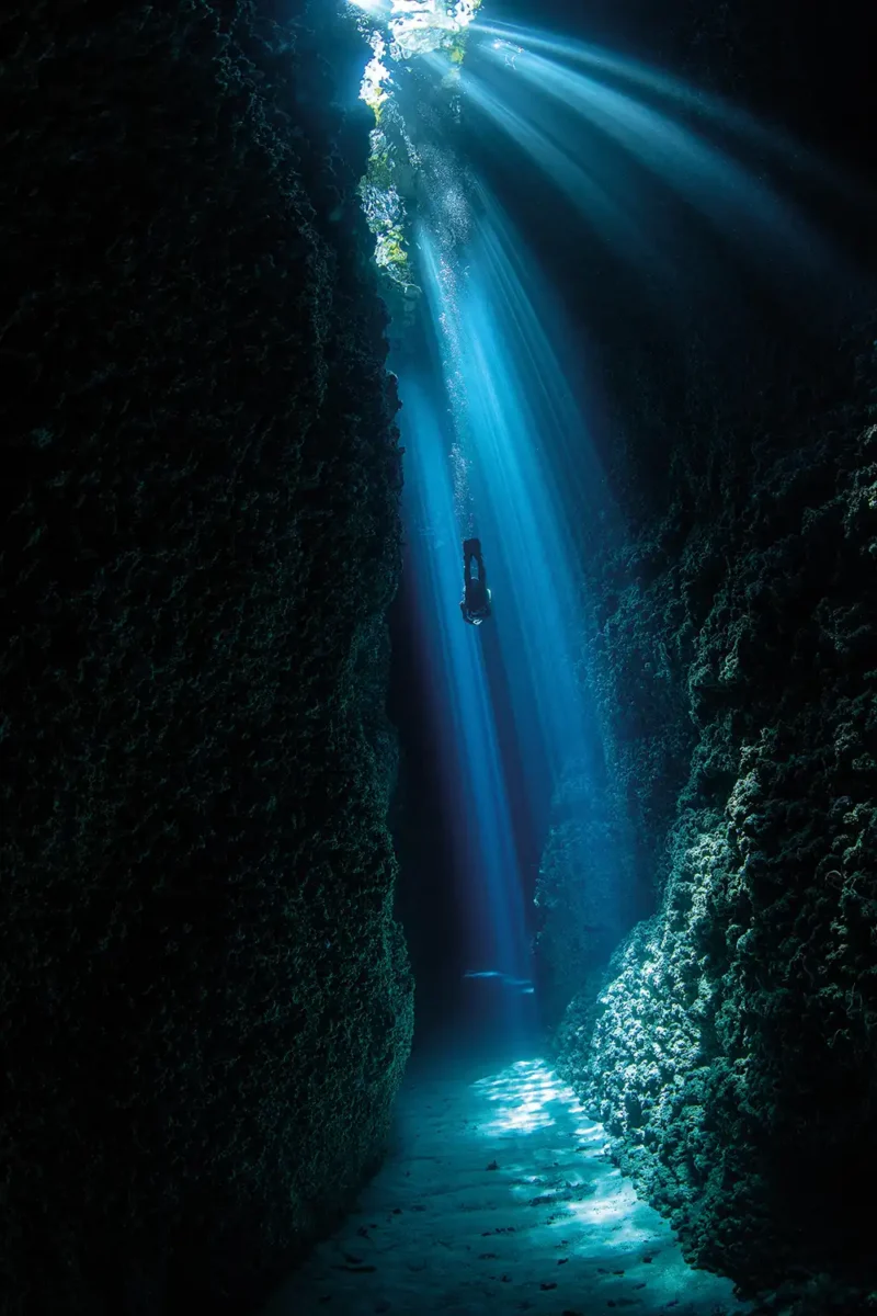 This natural spectacle occurs for only minutes each day when the sun is optimally positioned overhead. Most images of this iconic location are composed from the opposite perspective, toward the open ocean, but the moody effect and emphasis on the chasm’s ‘God rays’ are created by photographing a diver swimming in the opposite direction.