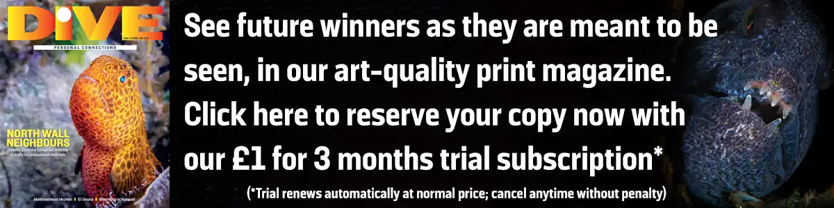 Michael Gallagher’s beautiful macro shot of a goby silhouetted against a brightly-lit whip coral, yet still capturing the fish’s eye takes second place and Cathy Holmes’ iconic picture of a motorcycle on board the wreck of the SS Thistlegorm takes third. Both win a year’s print and digital subscription to DIVE. Fantastic highly commended pictures from Christian Horras, Ian Uhalt, Fabi Fregonesi and JillAnne McCarty round out the best from this issue’s competition, and each win a year’s digital subscription.