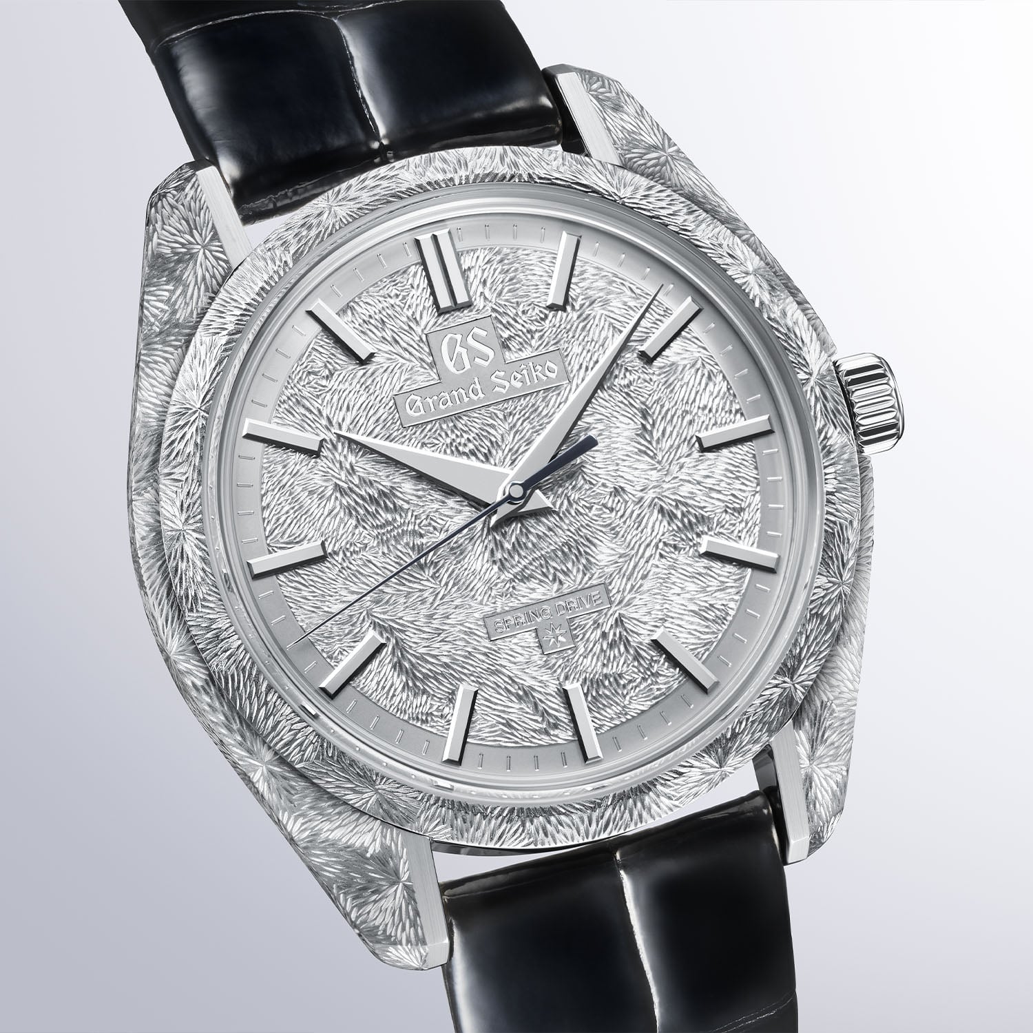The case selected for this 15-piece platinum limited edition is the brand’s iconic 44GS. Released in 1967, the 44GS came to define Grand Seiko’s “Grammar of Design” with powerful angles, broad flat surfaces and gleaming Zaratsu-polished reflections. The new watch, with a 40mm diameter and a slim 9.6mm profile, is hand-engraved with small indentations to recreate the sensation of flowing water. Highlighting its angular lugs, the innermost surfaces are Zaratsu polished.