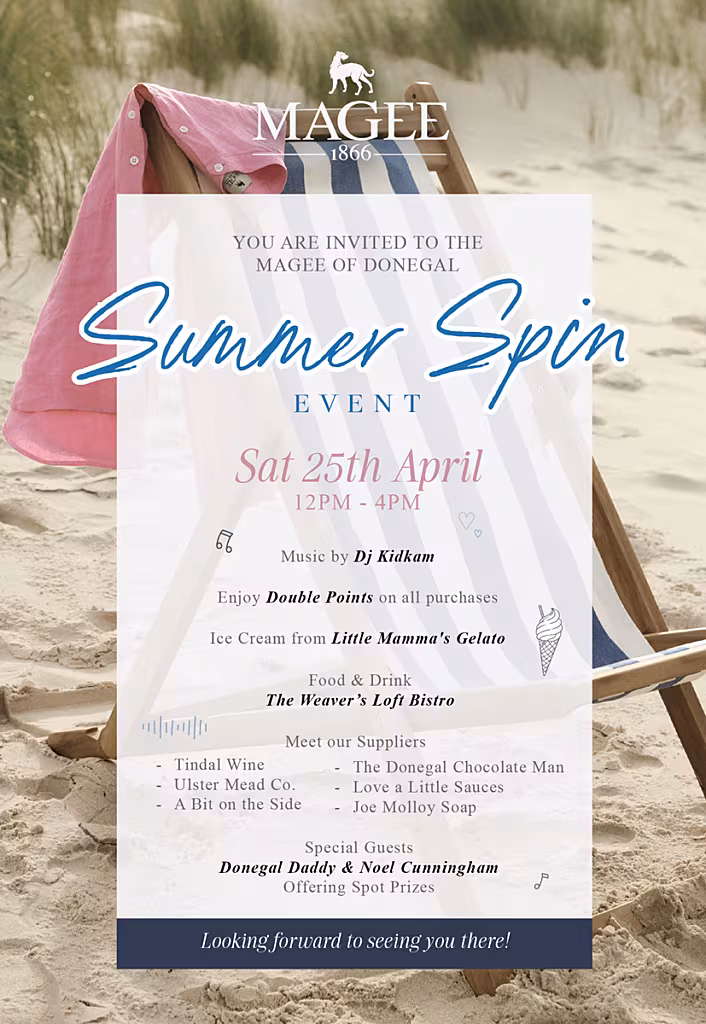Magee of Donegal is looking forward to welcoming everyone to its Summer Spin Event in Donegal Town on Saturday, 25th April, from 12 PM to 4 PM.