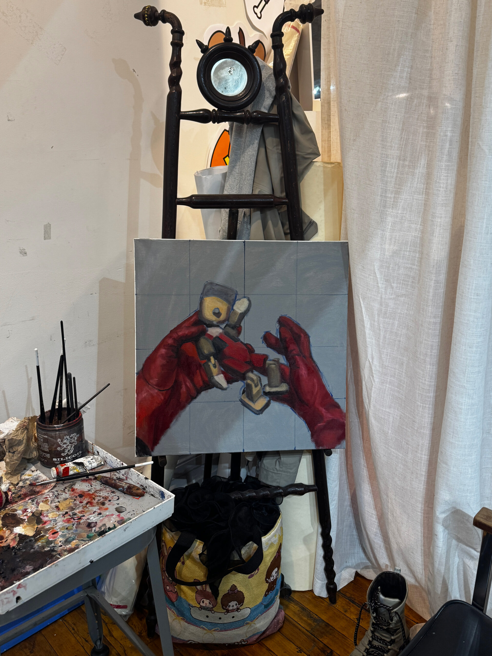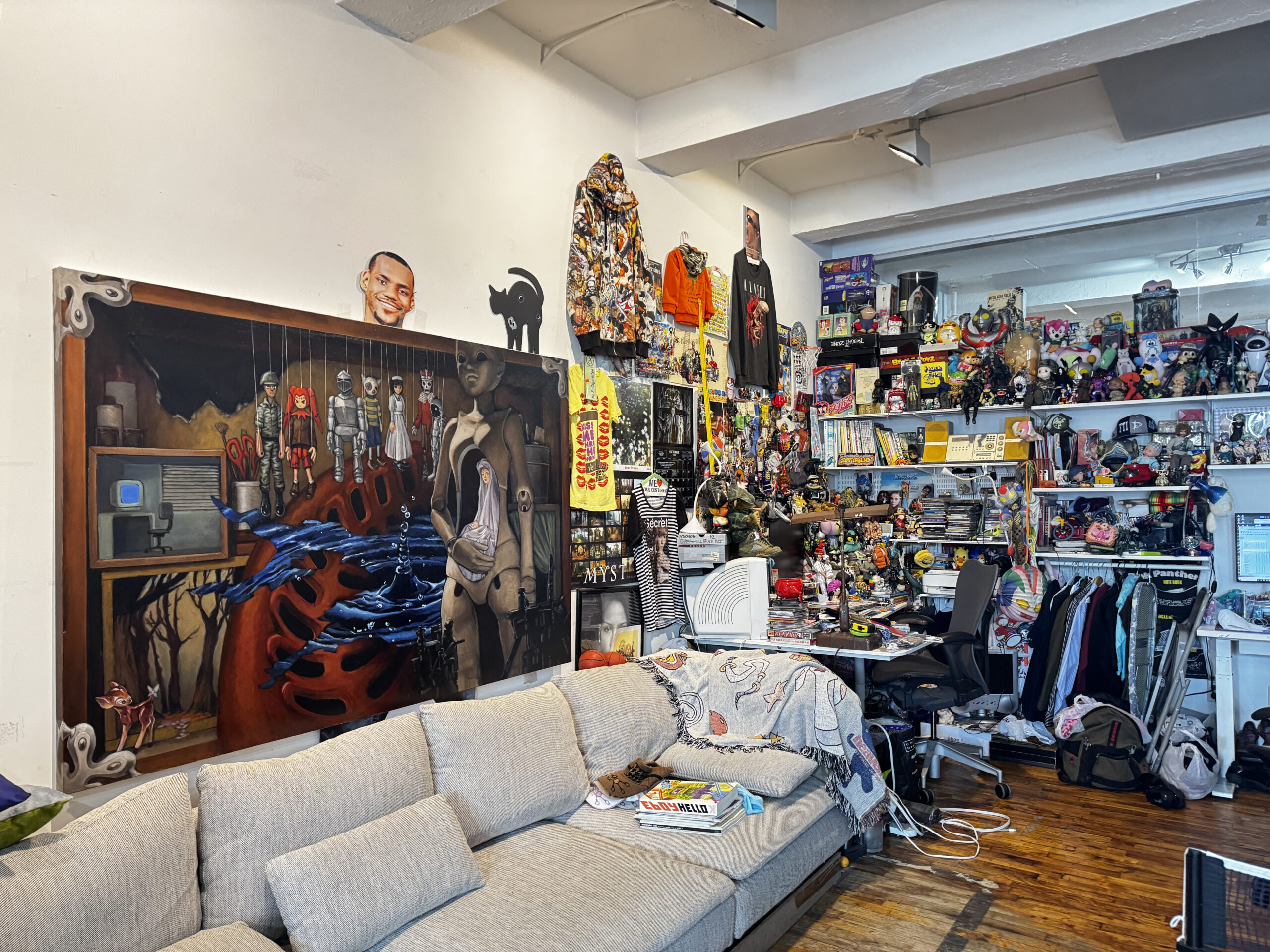 Nathalie Nguyen spent her teen years lurking on LiveJournal blogs and selling digital drawings of furries on the internet, and her debut solo exhibition doesn’t stray far from her roots. Over at Whaam!, a 7-piece oil painting series feels just like stepping into a moody child’s fantasy from the 90s. Hyperrealist dolls, Polly Pocket shoes, and puppets are the stars of the show, complimented by the gallery’s playful blue-and-red checkered floors. Nguyen’s fascinations with toys, nostalgia and the internet have established her niche in the art world, where she’s known for designing freaky sneakers and streetwear as the co-founder of Happy99, and for landing collaborations with Marc Jacobs and Reebok. Just before the show’s opening last Friday, we sent Nguyen a questionnaire to ask her about hustling online, collecting, and the importance of being bored.