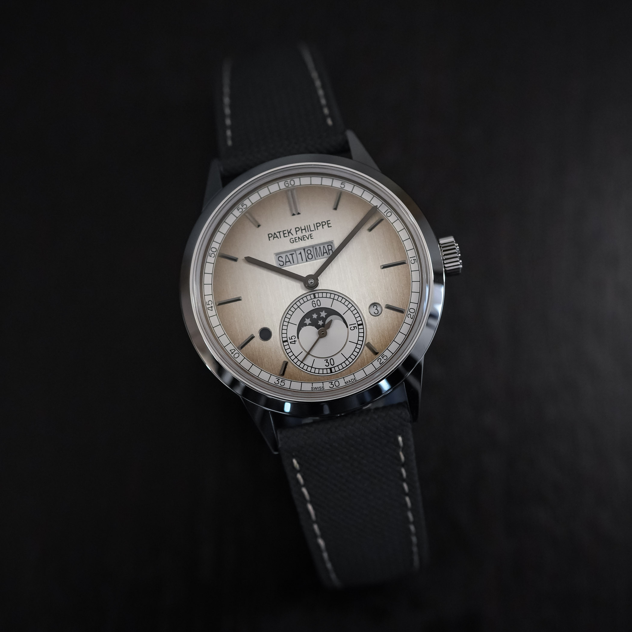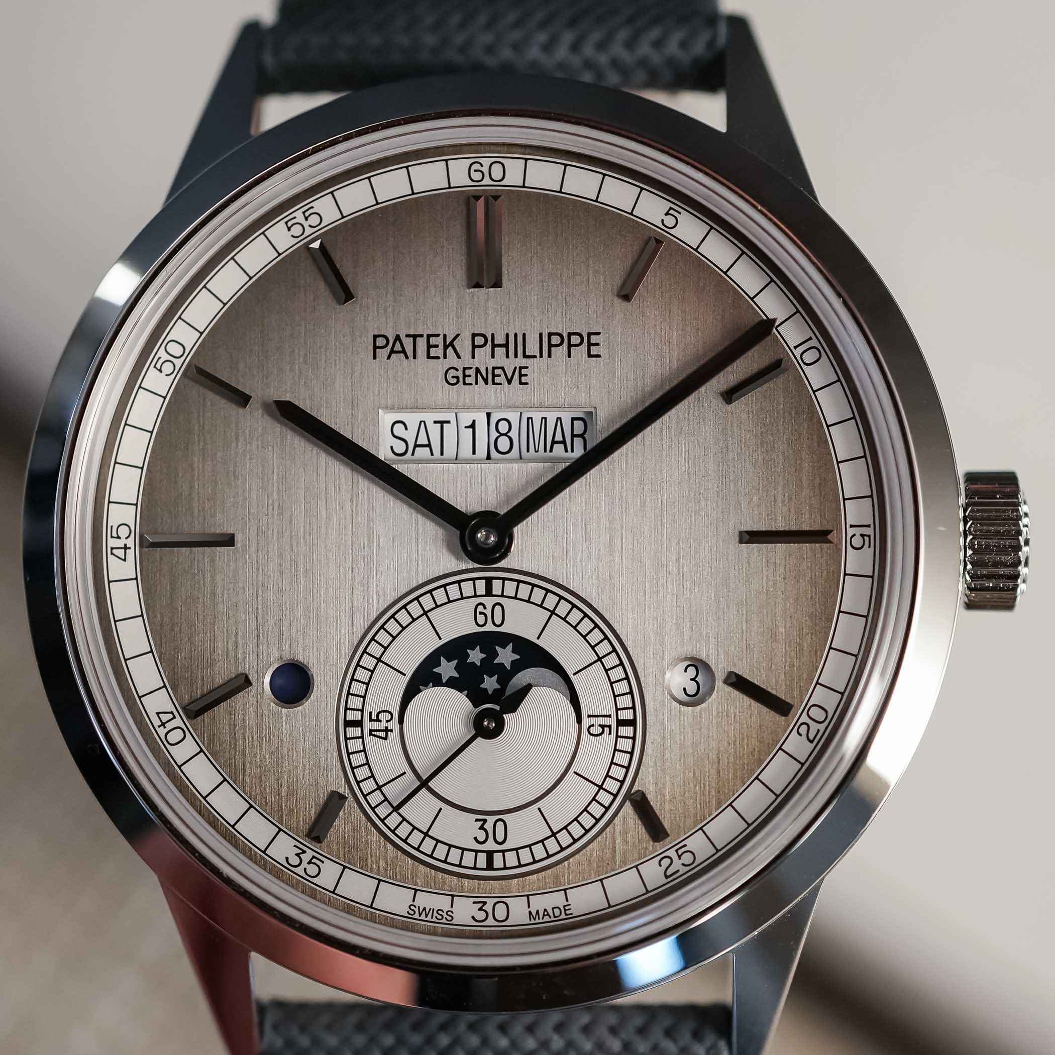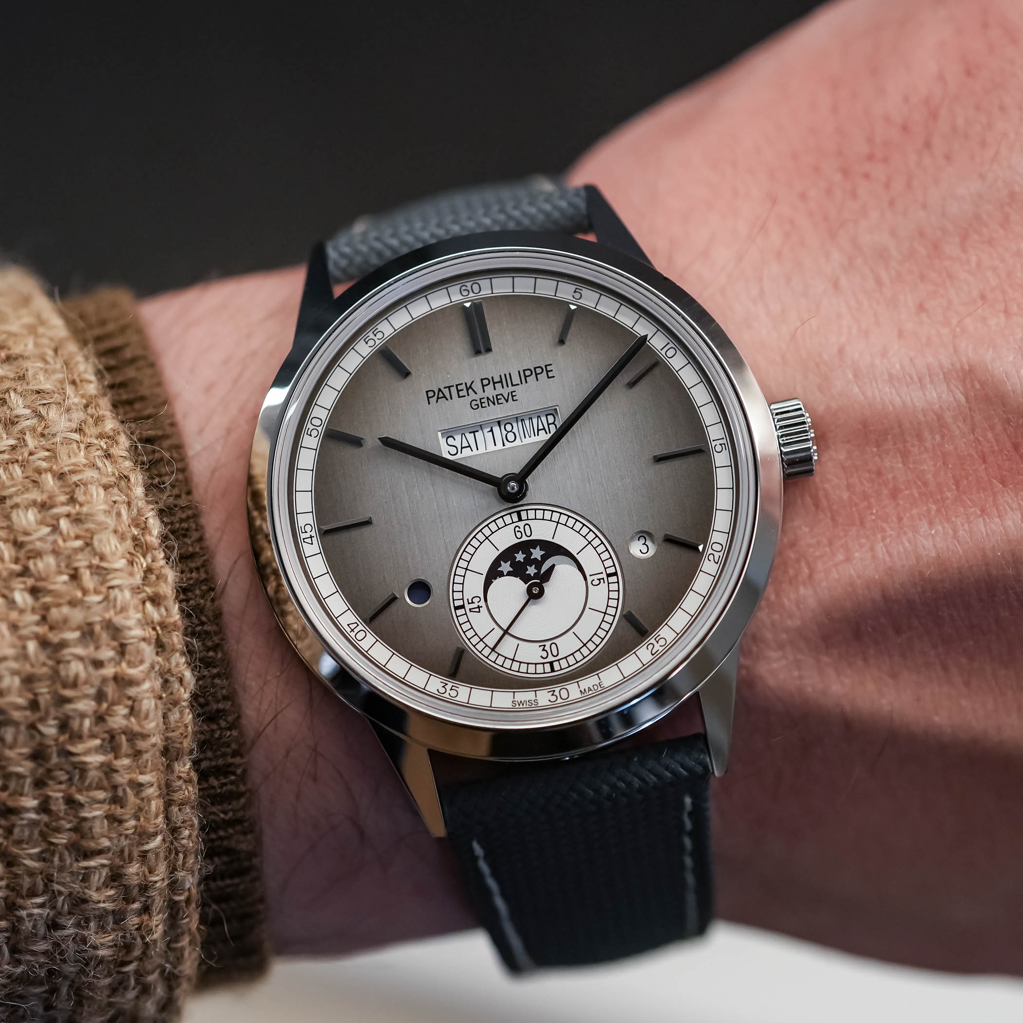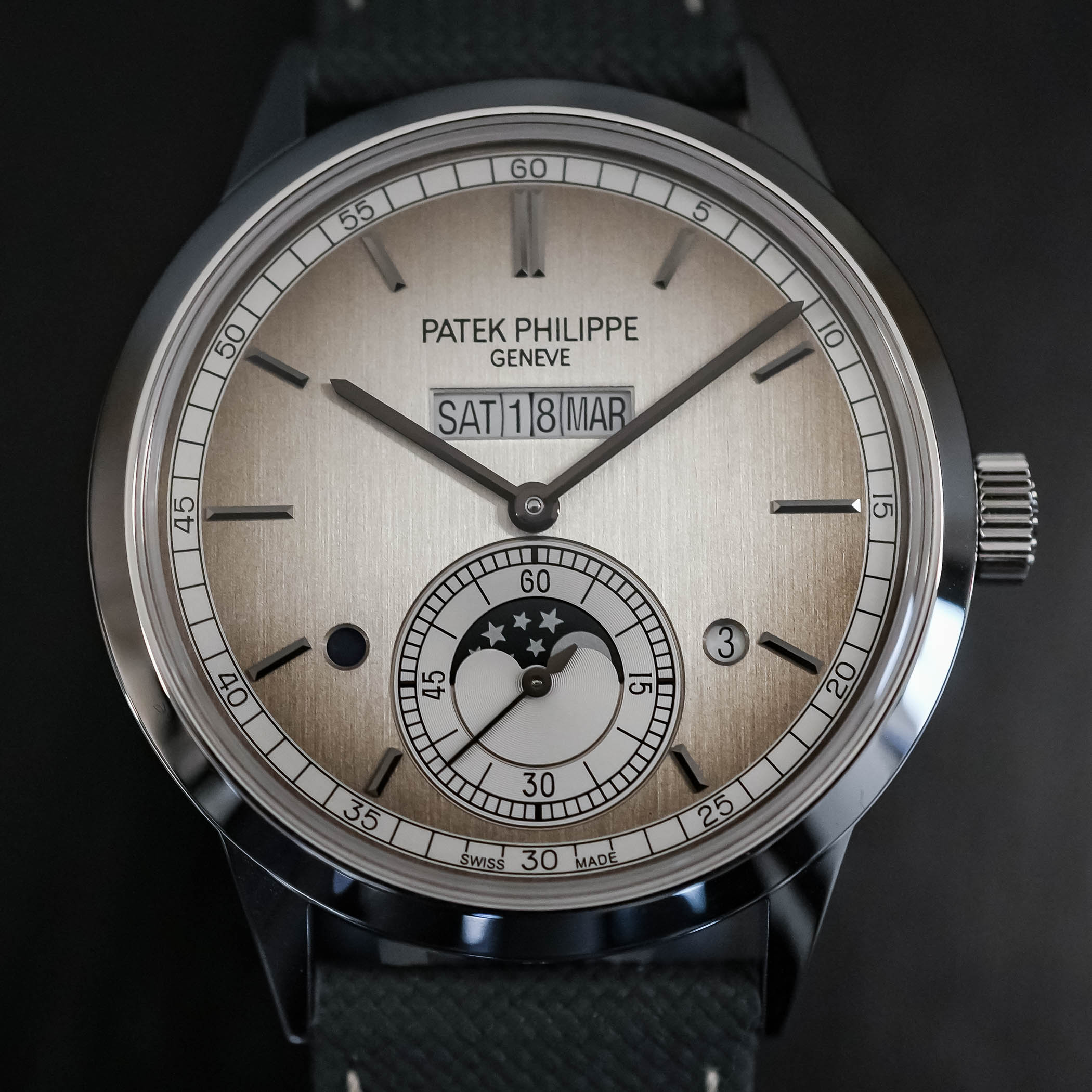 The watch is paired with a contemporary charcoal-grey composite strap with cream top stitching and a platinum triple-blade foldover clasp. It retails for CHF 124,800. More information at patekphilippe.com.