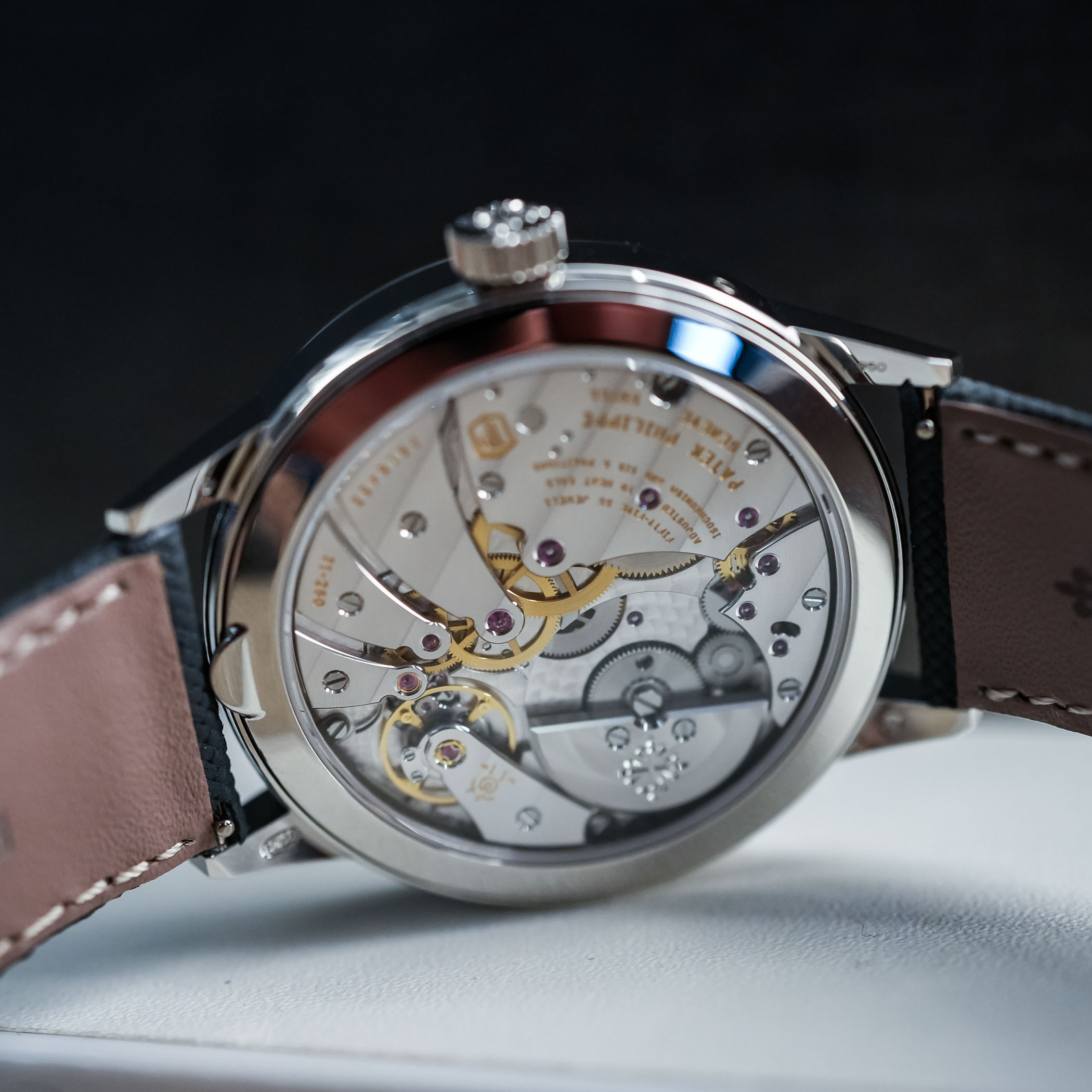 The watch is powered by the calibre 31-260 PS QL (PS = petite seconde; QL = quantième perpétuel en ligne), a modern in-house movement related to the 31-260 family used in the Ref. 5235 Annual Calendar Regulator of 2011. Reworked entirely to incorporate the PS small seconds and QL in-line perpetual calendar and protected by three patents, the torque of the spring barrel was increased by 20% to feed the energy-consuming perpetual calendar, and the frequency increased to 4Hz. As mentioned, the single-line calendar display with four rotating discs alone required 118 additional parts, bringing the total up to 503 components. Revealed on the caseback, you can see the off-centred platinum micro rotor, the elegant finger bridges decorated with Geneva stripes and polished bevels and other refined finishings like the perlage, circular graining and polished countersinks.