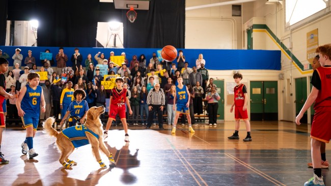 In the 12 minutes of footage we saw from the film at CinemaCon, the new Buddy walks past a statue of the original Buddy. When that Buddy meets a young boy in a wheelchair who has also lost his parents, they together watch an old VHS tape of the original film and become inspired to recruit Buddy for the school basketball team. It’s even the same Timberwolves team uniform Buddy wears, there’s another grumpy clown trying to get Buddy back, and there is yet another referee who says “there still ain’t a rule that dogs can’t play basketball.”