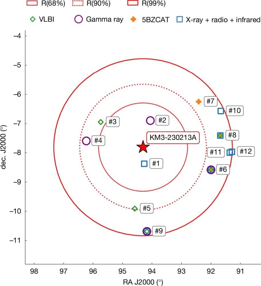This figure shows some of the potential sources for the high-energy neutrino. The red star indicates KM3-230213A, and the error regions within R(68%), R(90%) and R(99%) are shown with dotted, dashed and solid contours, respectively. The directions of the selected source candidates are shown as coloured markers. The colours and marker type indicate the criterion according to which the source was selected. The sources are numbered according to their proximity to KM3-230213A. Image Credit: The KM3NeT Collaboration 2026. Nature.