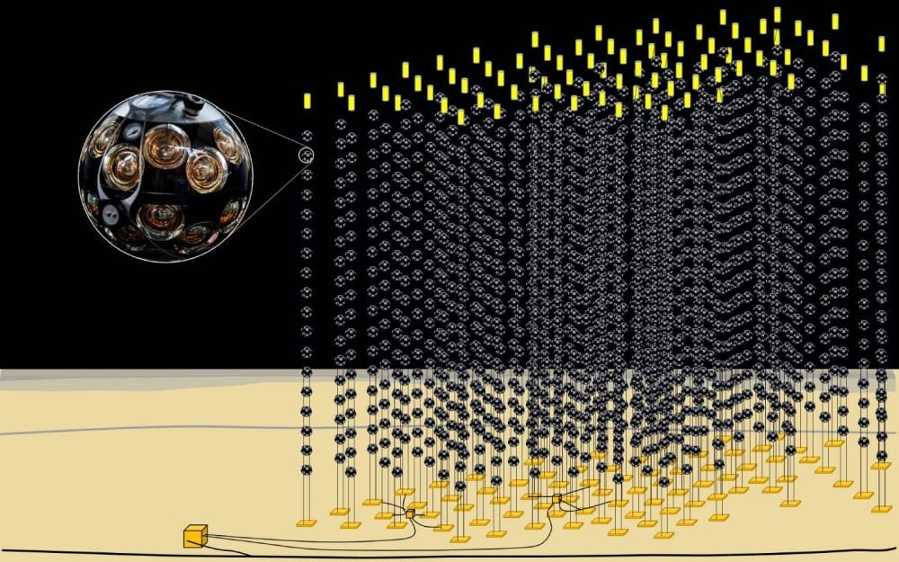 *This illustration shows KM3NeT, the Cubic Kilometre Neutrino Telescope. It consists of strings of detectors anchored the Mediterranean sea floor. A mass of detectors are needed since neutrinos seldom interact with other matter. Image Credit: KM3NeT Collaboration*