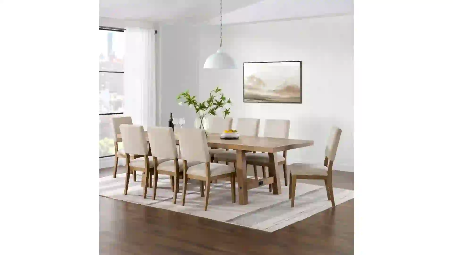 If you love entertaining, you’ll love this Graham dining table. It comes with eight chairs upholstered in beige, and an 18-inch removable leaf stores under the table, so you can modify the table length to your needs. Whether you’re hosting family dinners or a casual barbecue, this table will welcome everyone.