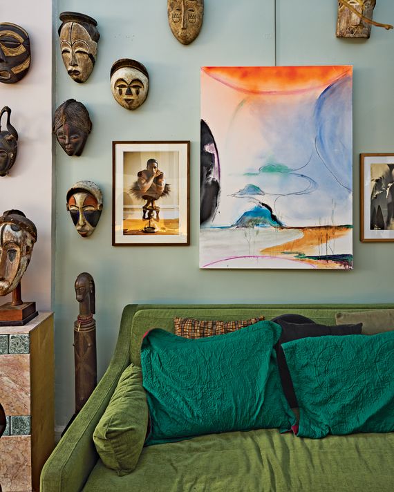 The Sitting Area Preston’s In the Four Moments of the Sun (2025) is above the sofa. The photos by John Edmonds (left) and Adger Cowans are under masks by the Fang people of Gabon.