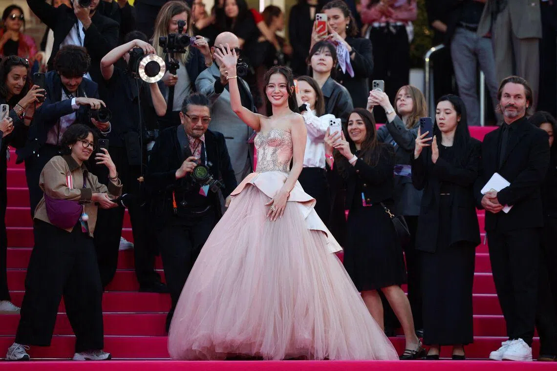 Jisoo poses on the pink carpet during the opening of Canneseries in southern France on April 23, 2026.