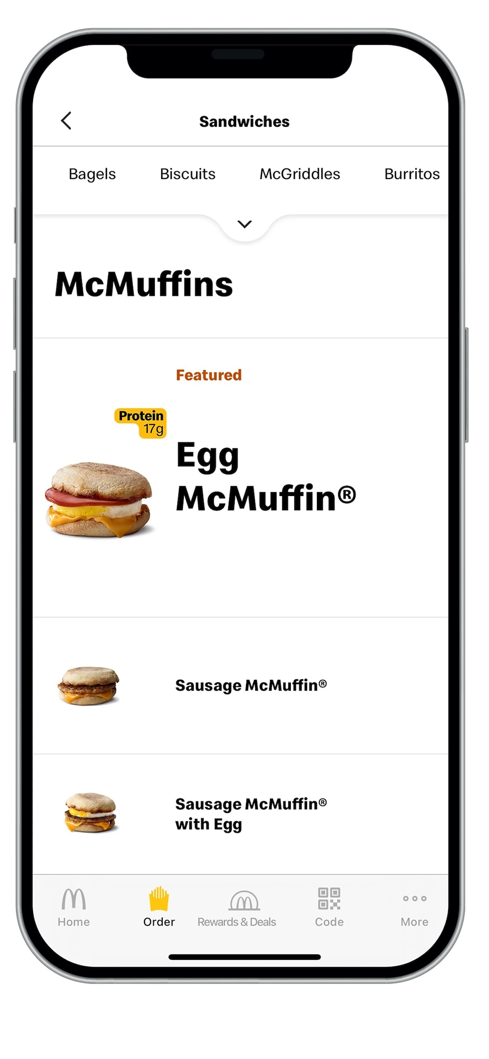 A view of the ordering options in the McDonald’s app for higher protein menu items.