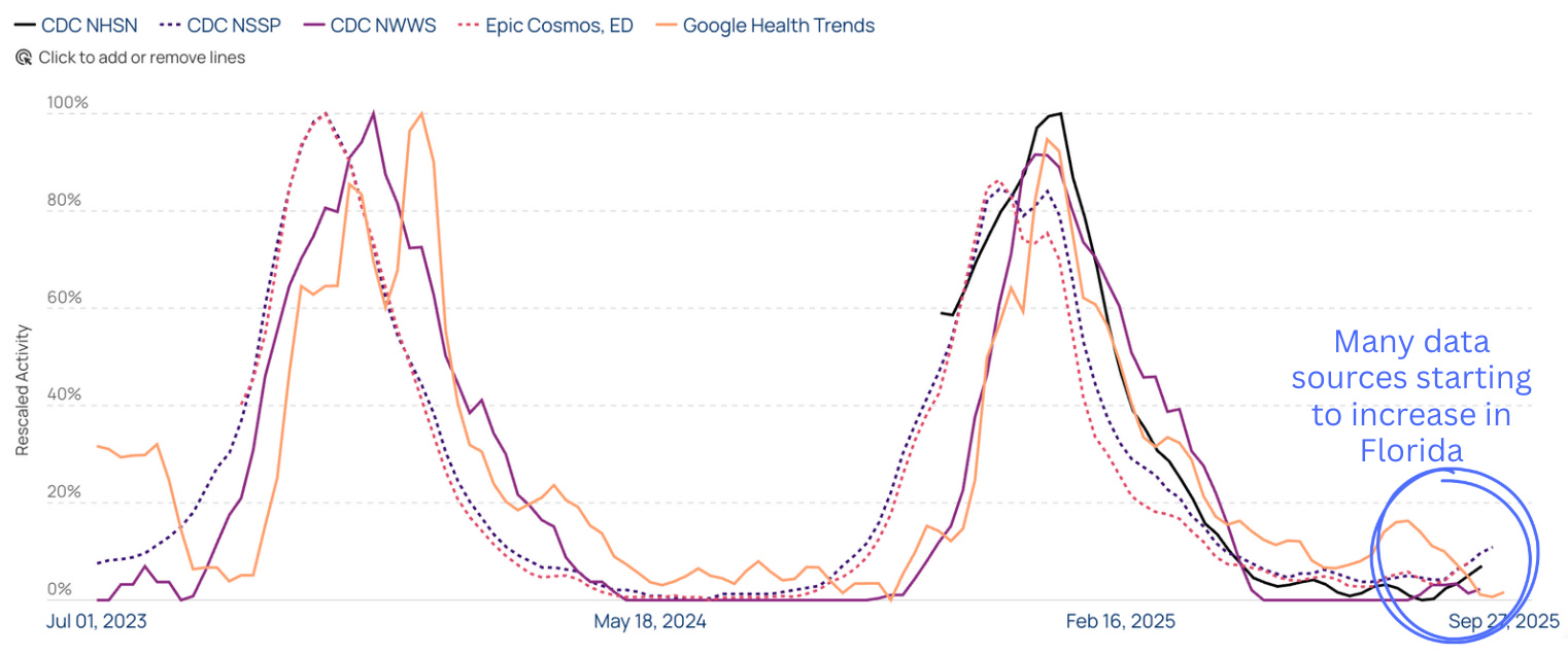 The federal government shutdown means most CDC data updates are on pause. States are still reporting, but the CDC is important because it compiles all data into a single national picture. Currently, that picture is incomplete. I’m relying on PopHIVE from the Yale School of Public Health, which combines multiple data sources beyond the federal government, including Google Trends and medical records, to fill in the gaps. (Disclosure: I helped build it.)