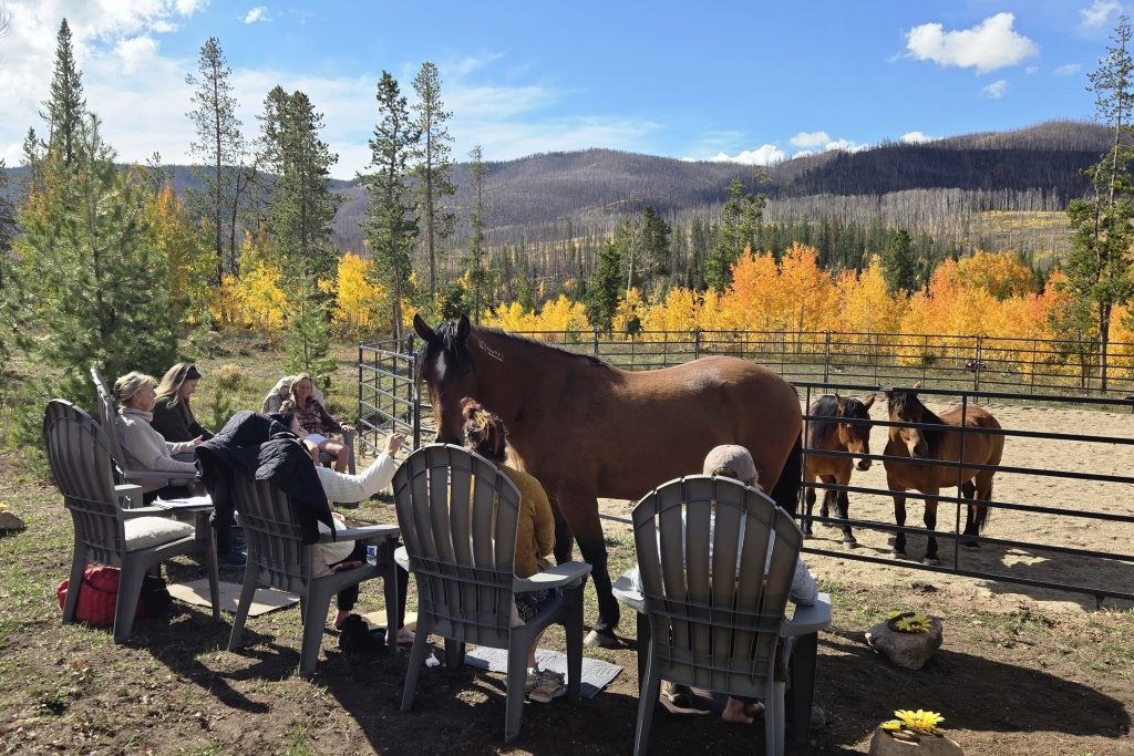 On a sunny Sunday morning in late September, a small group of women sat in chairs in a semi-circle facing a horse corral holding two mustangs, who were previously rescued from federal holding facilities. Chalet Ranch co-owner Andrea Krauer led the group in a relaxing guided meditation practice, while two friendly dogs also offered lots of petting opportunities. While the two mustangs gently horsed around inside the corral, a third mustang outside the corral ambled over to visit up close with each guest.