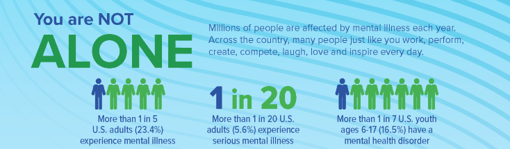 Millions of people are affected by mental illness each year. Across the country, many people just like you work, perform, create, compete, laugh, love and inspire every day.