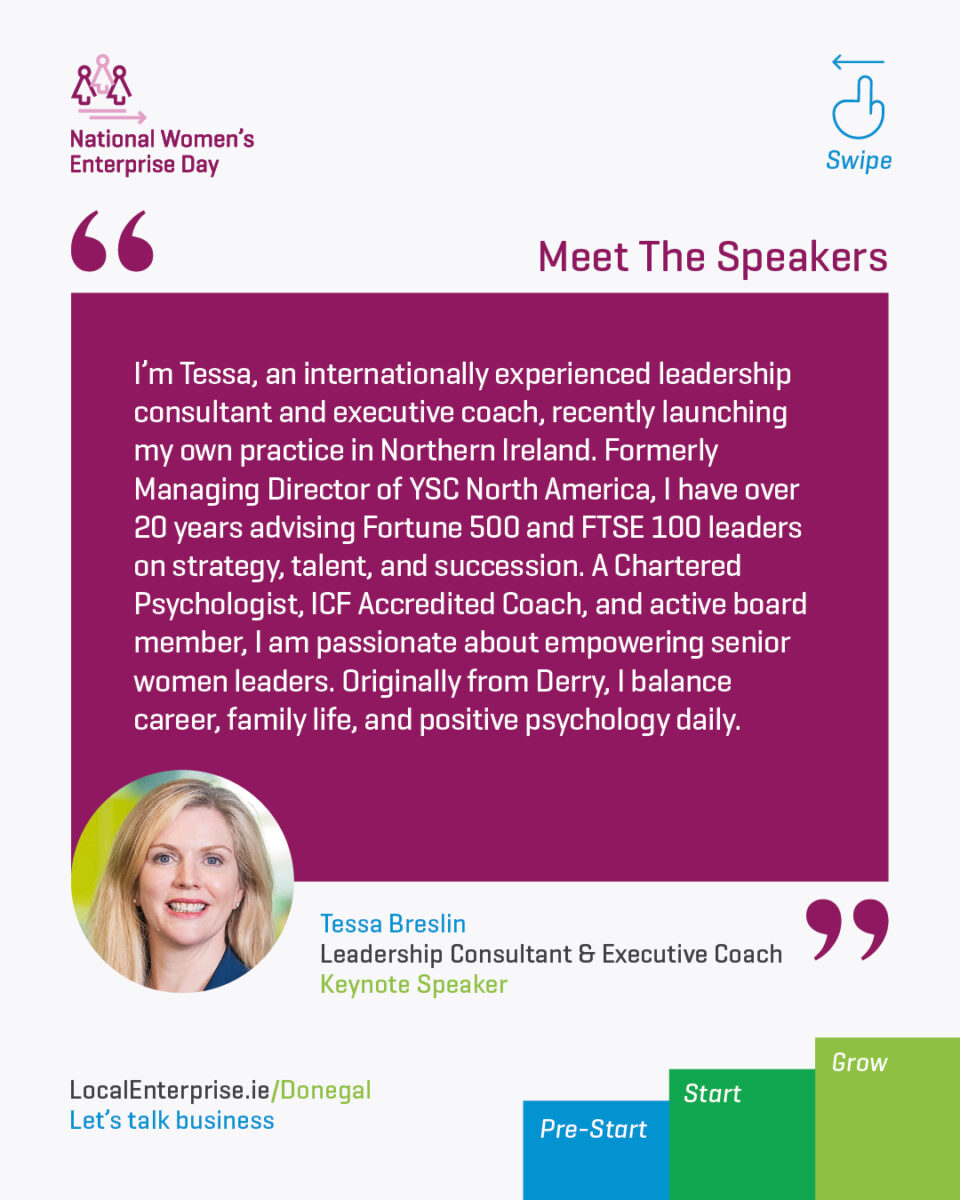 Keynote speaker Tessa Breslin, an internationally recognised leadership advisor to Fortune 500 and FTSE 100 companies, will share perspectives on strategy, resilience, and growth. She will be joined by NWED Donegal Ambassador Olivia Finney, co-founder of New Kid Coffee in Letterkenny, as well as panel speakers Sally Murphy, a TEDx speaker and communications consultant, and Caroline McLaughlin, Executive Director at Morgan Stanley.