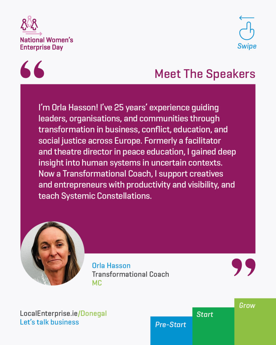 Transformational coach, Orla Hasson will MC the National Women’s Enterprise Day event in The Mount Errigal on Thursday, 16th October.
